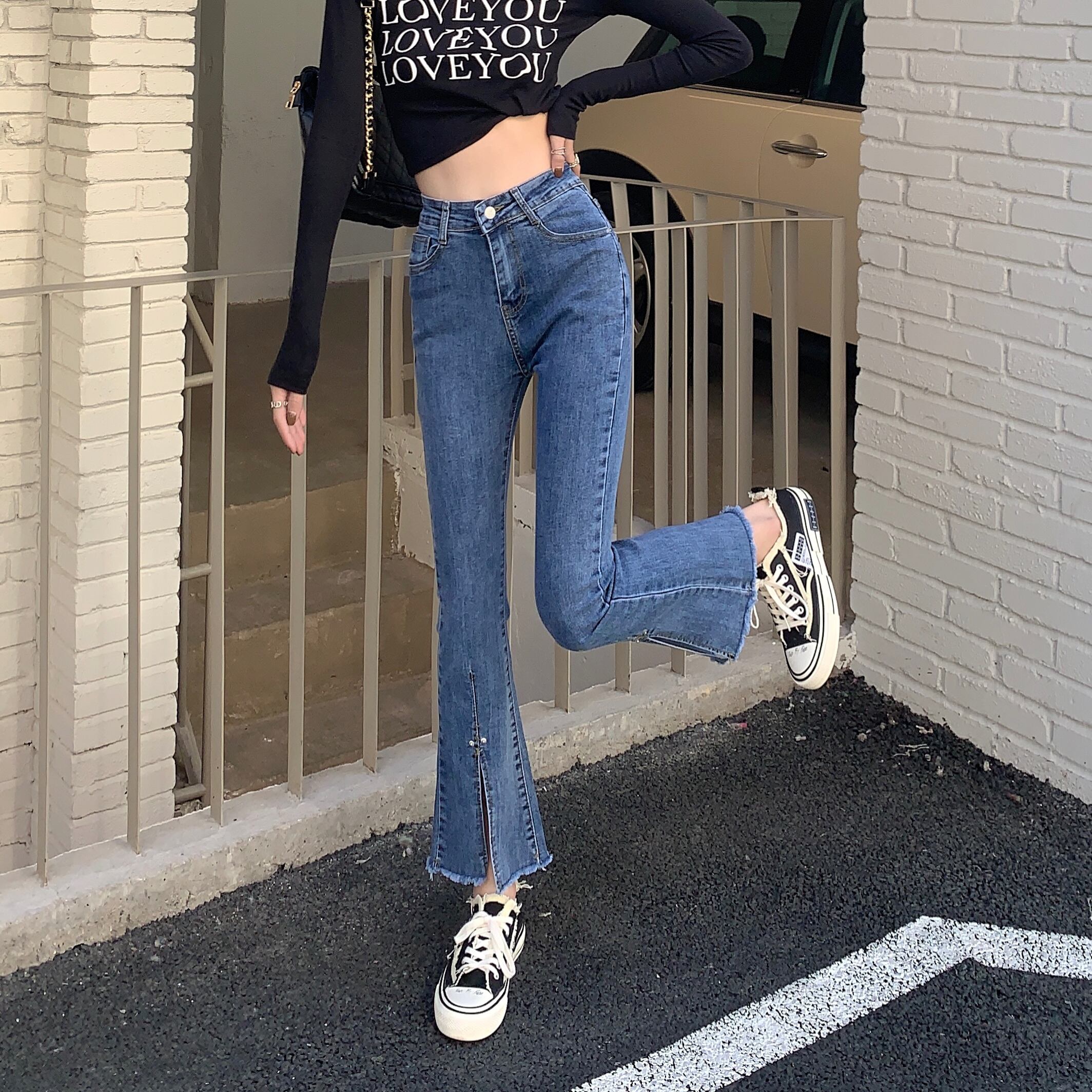 Slit jeans women's high waist slimming micro flared pants 2022 new spring design small chic pants ハイウェスト レッド スプリング 春物 s576158297610870