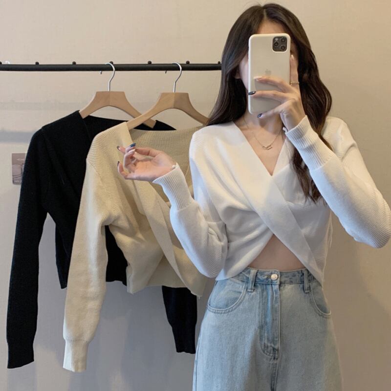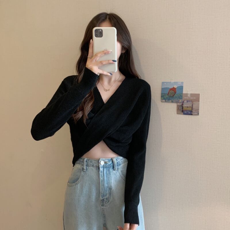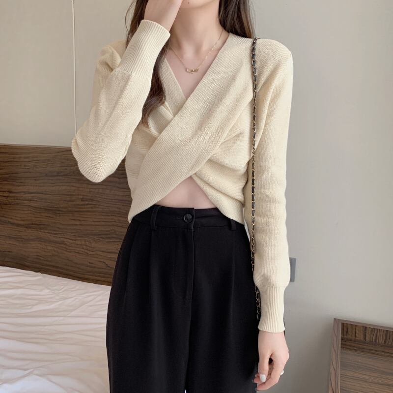 French retro v-neck crossover careful machine long-sleeved pullover sweater women's spring and autumn tops 2022 new ロング レトロ スプリング 春物 オータム 秋物 Vネック s576198532050118
