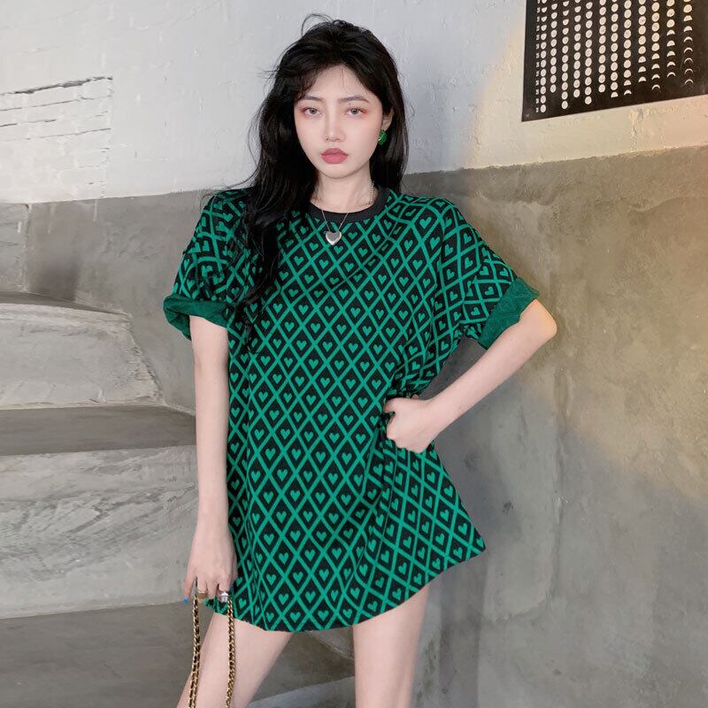 Green diamond short-sleeved T-shirt women's autumn and winter inner bottoming shirt 2022 new design loose all-match top オータム 秋物 ウィンター 冬物 Tシャツ グリーン s576139942828846