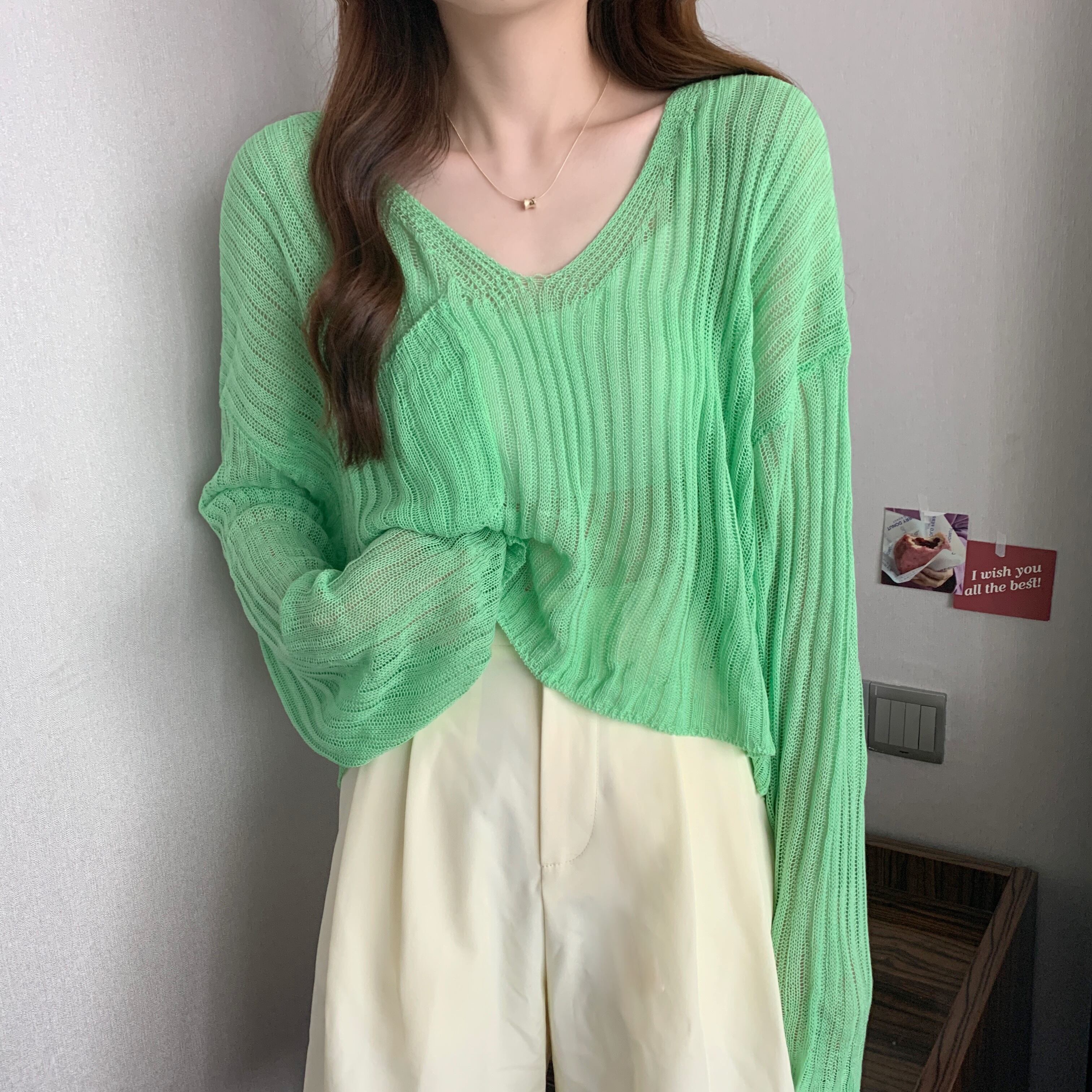 Lazy V-Neck Cropped Top Ice Silk Thin Long Sleeve Knit Sweater Hollow Sunscreen Blouse Women's Spring Autumn 2022 ロング 長袖 ブラウス スプリング 春物 オータム 秋物 Vネック シルク s57618856854285