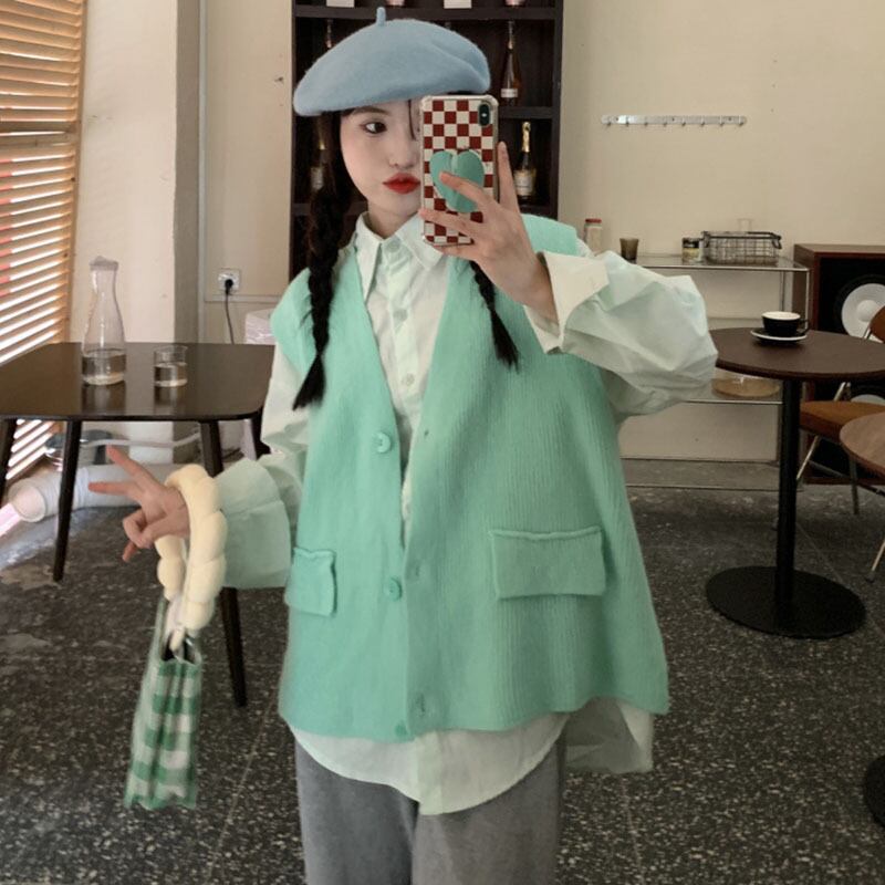 V-neck sweater vest women's spring and autumn outer vest jacket layered loose waistcoat knitted vest shirt two-piece set レッド スプリング 春物 オータム 秋物 Vネック s576194461796935