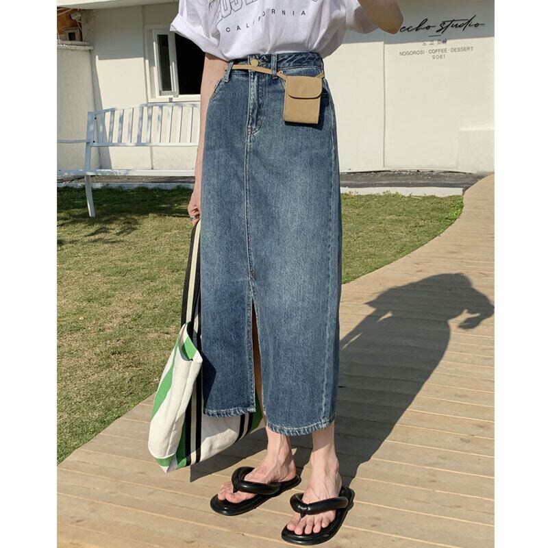 Retro denim split skirt women's summer mid-length a-line skirt 2022 new high-end design long skirt ロング レトロ サマー 夏物 スカート Aライン s576117551020109