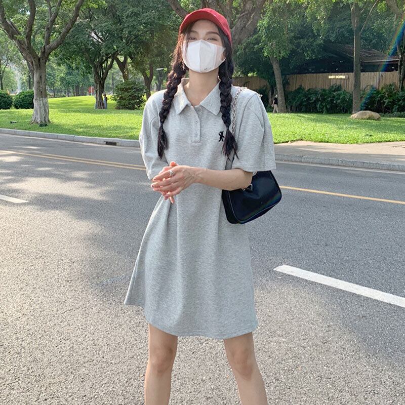 Grey polo collar T-shirt dress women's summer 2022 new preppy style small loose casual skirt カジュアル サマー 夏物 スカート Tシャツ s576168758095178