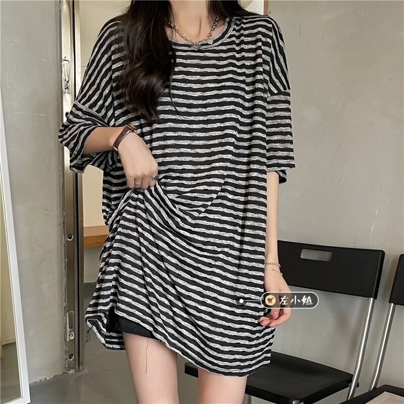 Bottom missing striped short-sleeved T-shirt women's design sense summer loose oversize mid-length top ins サマー 夏物 ストライプ Tシャツ s576149029357271