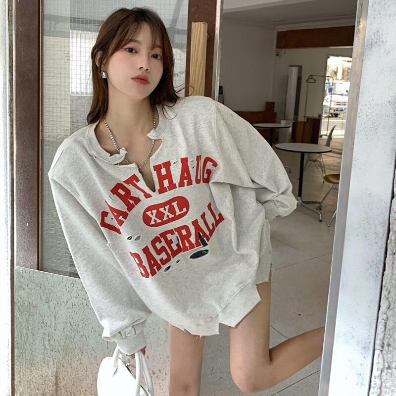 Black ripped sweater women's spring and autumn thin section 2022 new loose version design sense top clothes trendy ins ブラック スプリング 春物 オータム 秋物 s57614311685487
