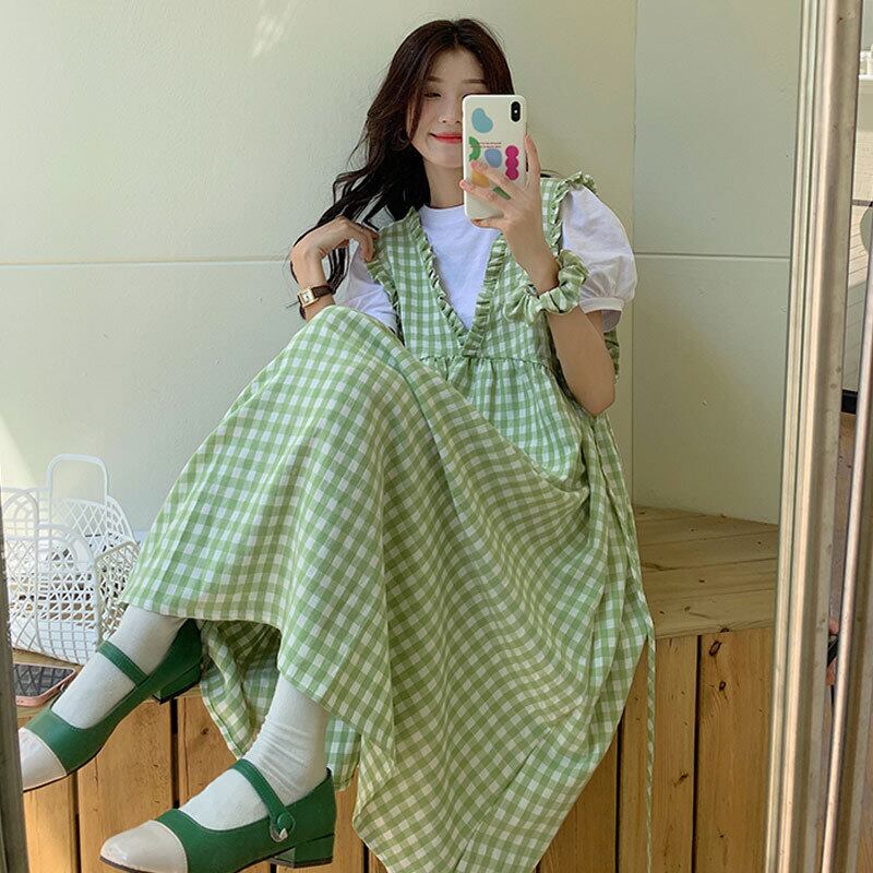 V-neck plaid vest dress women's summer 2022 new style chic western style age-reducing milk sweet long skirt ロング 大人ガーリー スウィート キュート カジュアル サマー 夏物 スカート Vネック s576170820157915