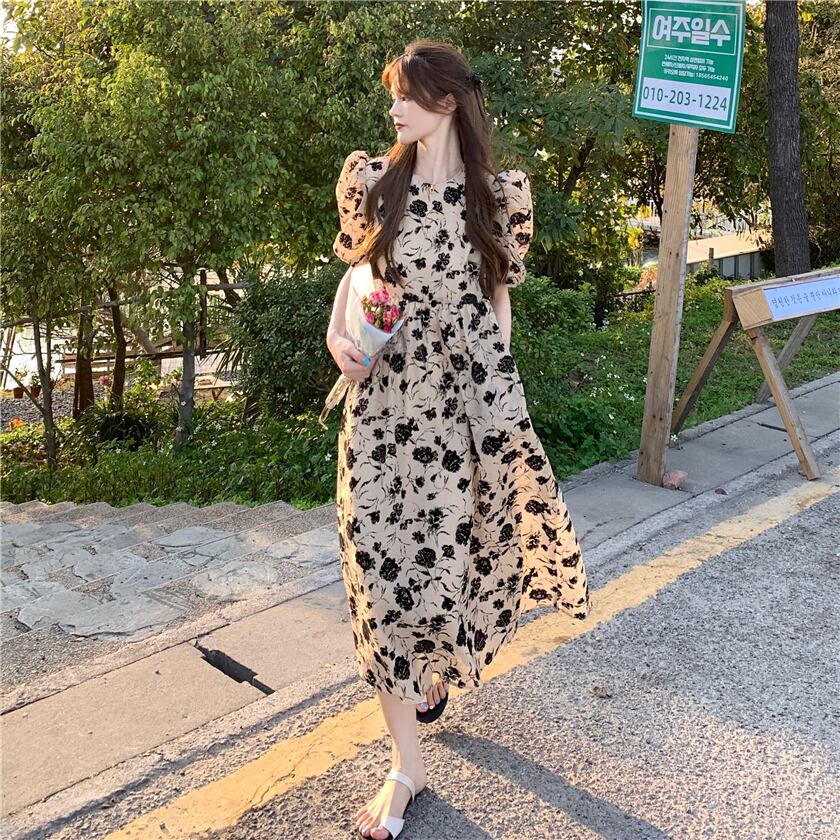 Puff sleeve floral dress women's summer 2022 new French retro high-quality temperament milk sweet long skirt ロング レトロ 大人ガーリー スウィート キュート カジュアル サマー 夏物 花柄 スカート s576145428854158