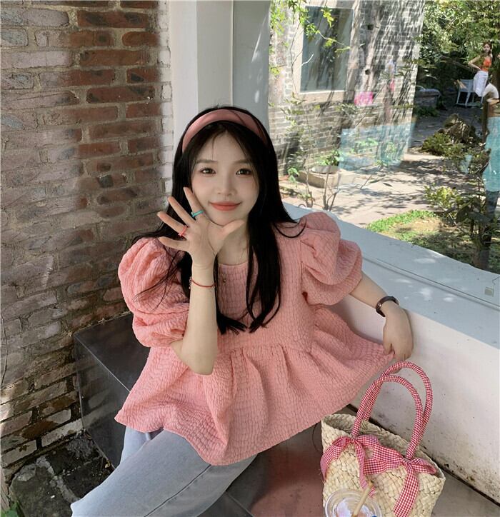 Pink Puff Sleeve Chiffon Shirt Women's Summer 2022 Small Temperament Gentle Unique Short Top ショート ピンク シフォン サマー 夏物 s576140862347542