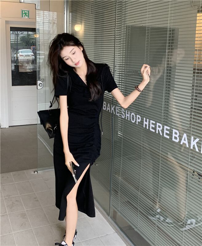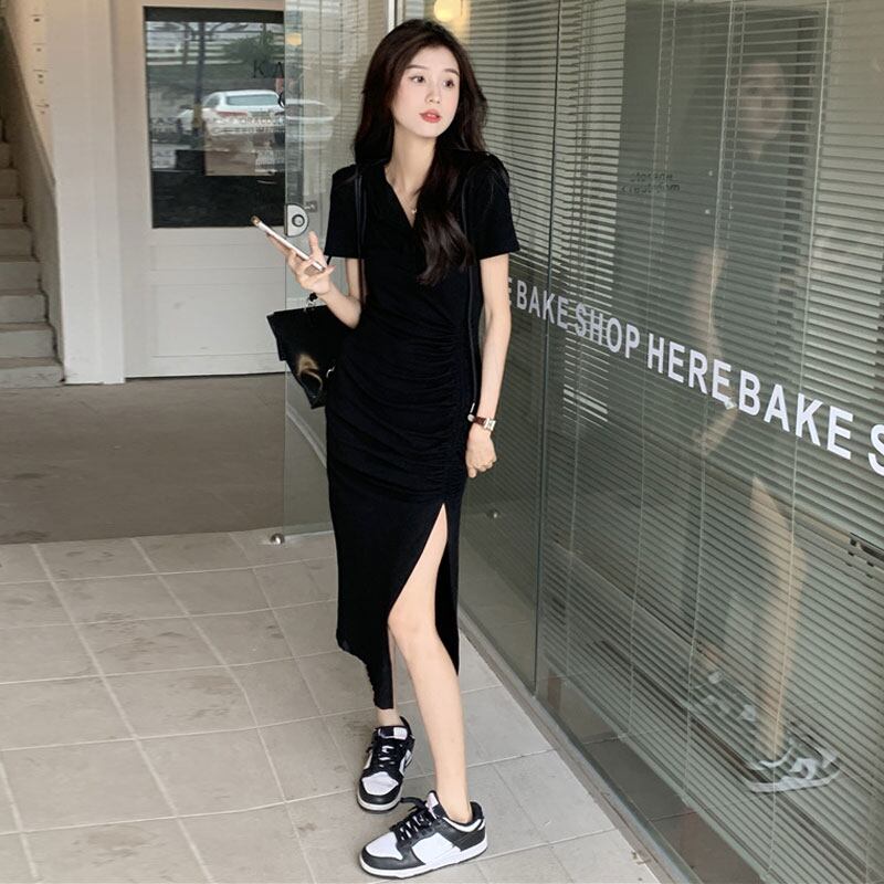 Black dress women's summer 2022 new retro Hong Kong-style temperament light familiar style slim slit bag hip long skirt ロング ブラック レトロ サマー 夏物 スカート スリム s576125395577278
