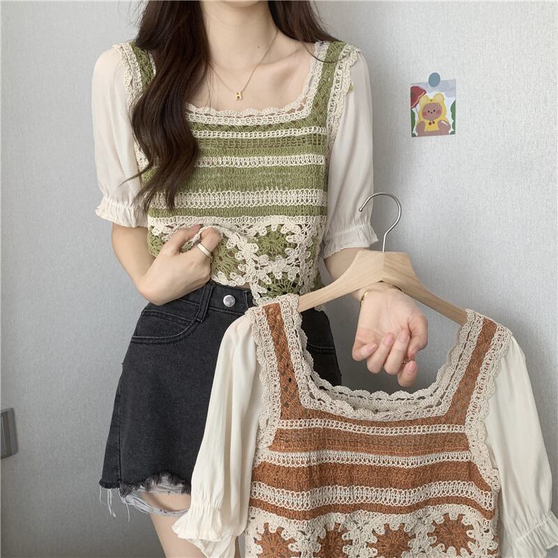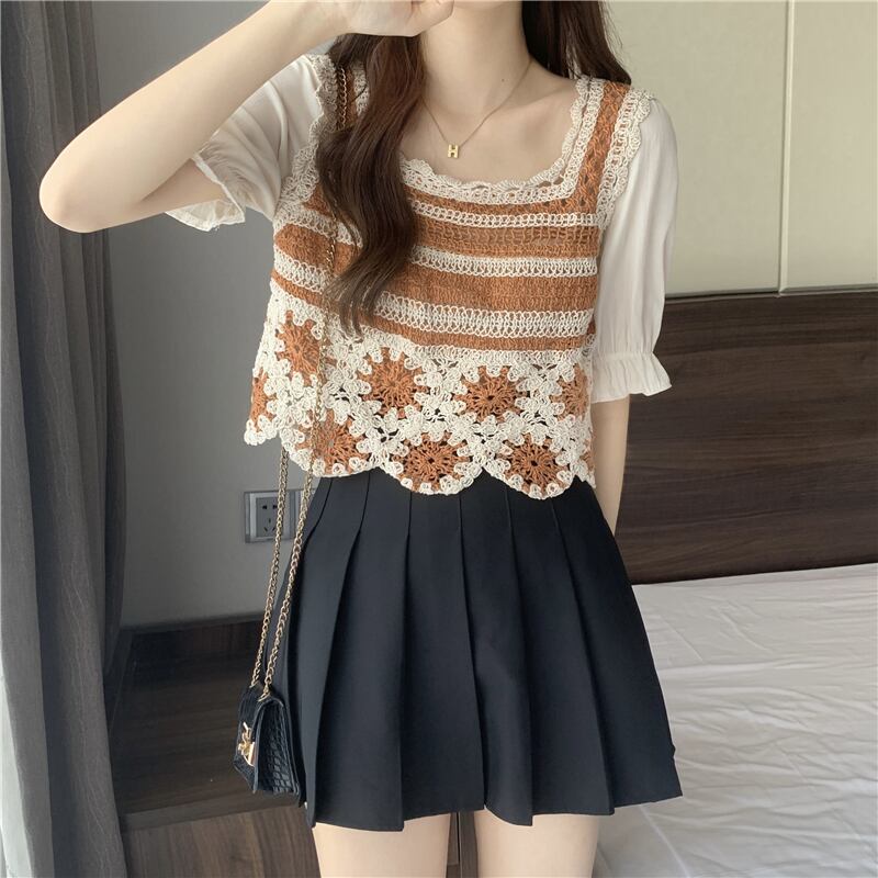 Short-sleeved T-shirt women's summer design sense niche 2022 new fake two-piece sweet square collar short top clothes ショート 大人ガーリー スウィート キュート カジュアル サマー 夏物 Tシャツ スクウェア s576112448331153