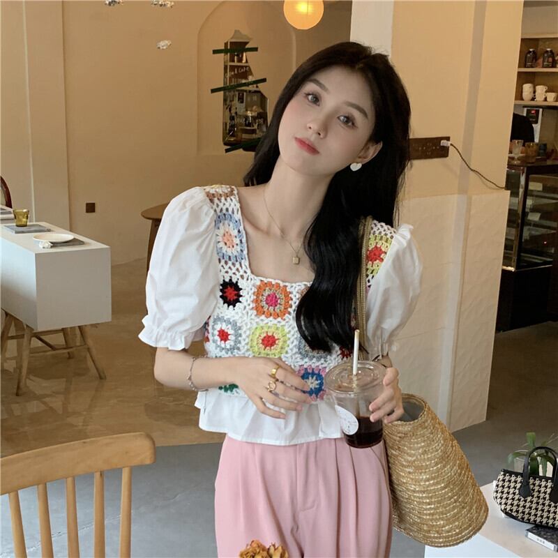 Chic Heavy Industry Crochet Hollow Short Puff Sleeve Shirt Top Women's 2022 Summer Style Square Collar Shirt ショート サマー 夏物 スクウェア s57619581754362