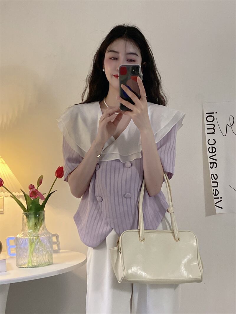 French chic short top women's design sense niche summer gentle high-end purple striped short-sleeved shirt ショート サマー 夏物 ストライプ パープル s576164177900489