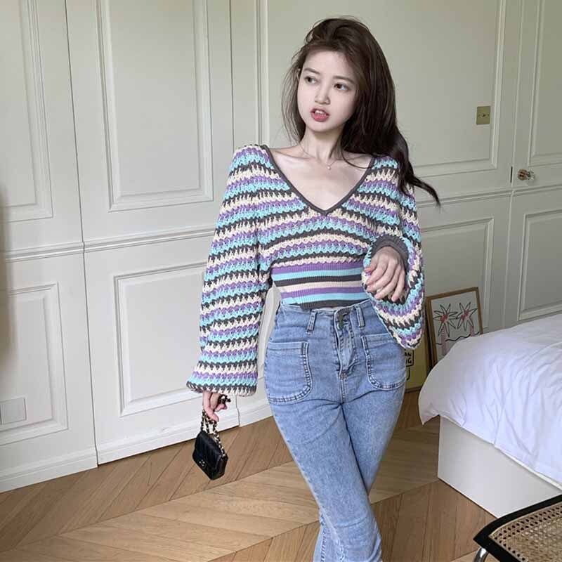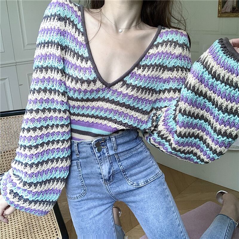 Striped short sweater women's spring and autumn loose wear 2022 new retro design pullover V-neck top ショート レトロ スプリング 春物 オータム 秋物 Vネック ストライプ s576133464934998