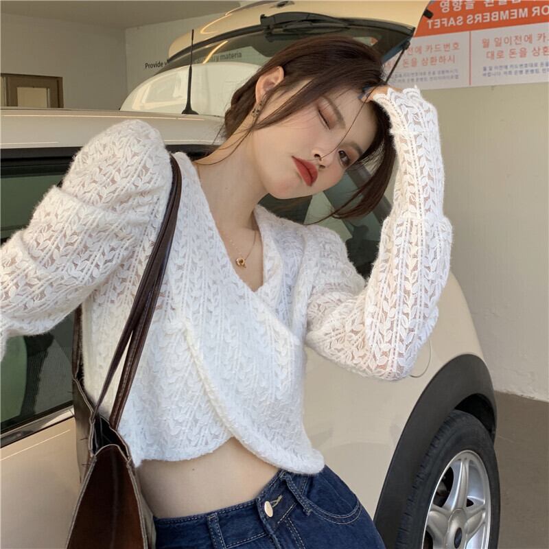 waist chic short top women's autumn and winter design sense with 2022 new sweet white lace shirt ショート ホワイト レース 大人ガーリー スウィート キュート カジュアル オータム 秋物 ウィンター 冬物 s576122302260883