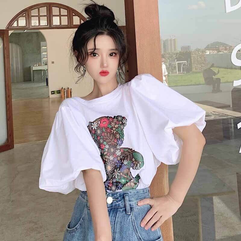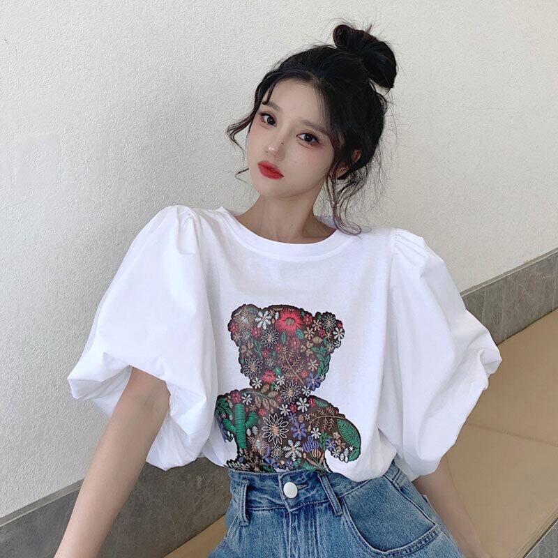 Puff-sleeved short-sleeved T-shirt women's design sense niche summer 2022 new chic loose cotton top clothes ins tide コットン サマー 夏物 Tシャツ s576126783586064