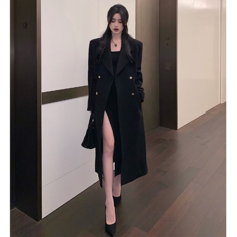 Black long woolen coat women's autumn and winter 2022 new French high-end design sense Hepburn woolen coat ロング ブラック オータム 秋物 ウィンター 冬物 s576154444336018
