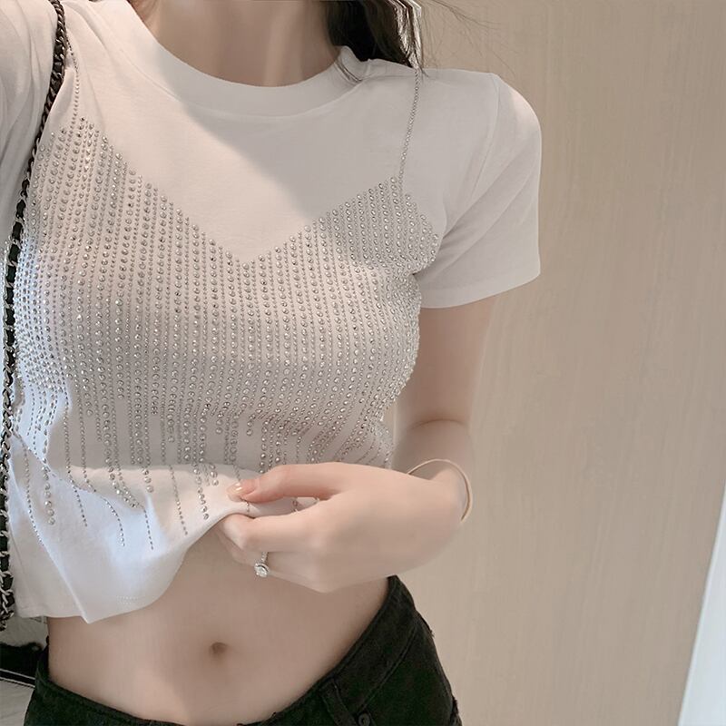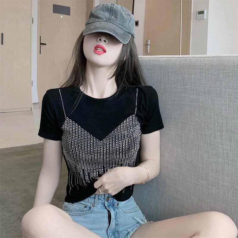 Front-shoulder short-sleeved T-shirt women's clothing design sense niche summer sweet babes chic and unique navel crop top ins tide 大人ガーリー スウィート キュート カジュアル サマー 夏物 Tシャツ s5761849992272