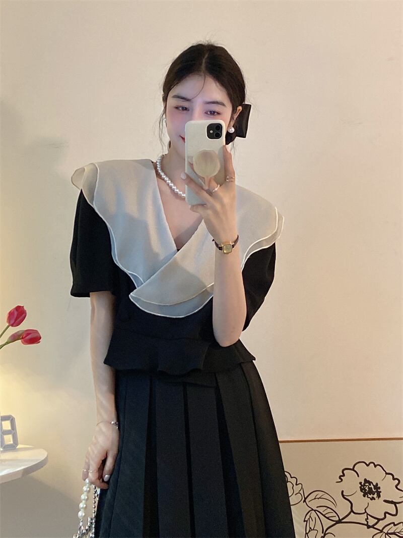 French retro V-neck short top women's summer design chic shirt 2022 new gentle short-sleeved shirt ショート レトロ サマー 夏物 Vネック s576196973363938