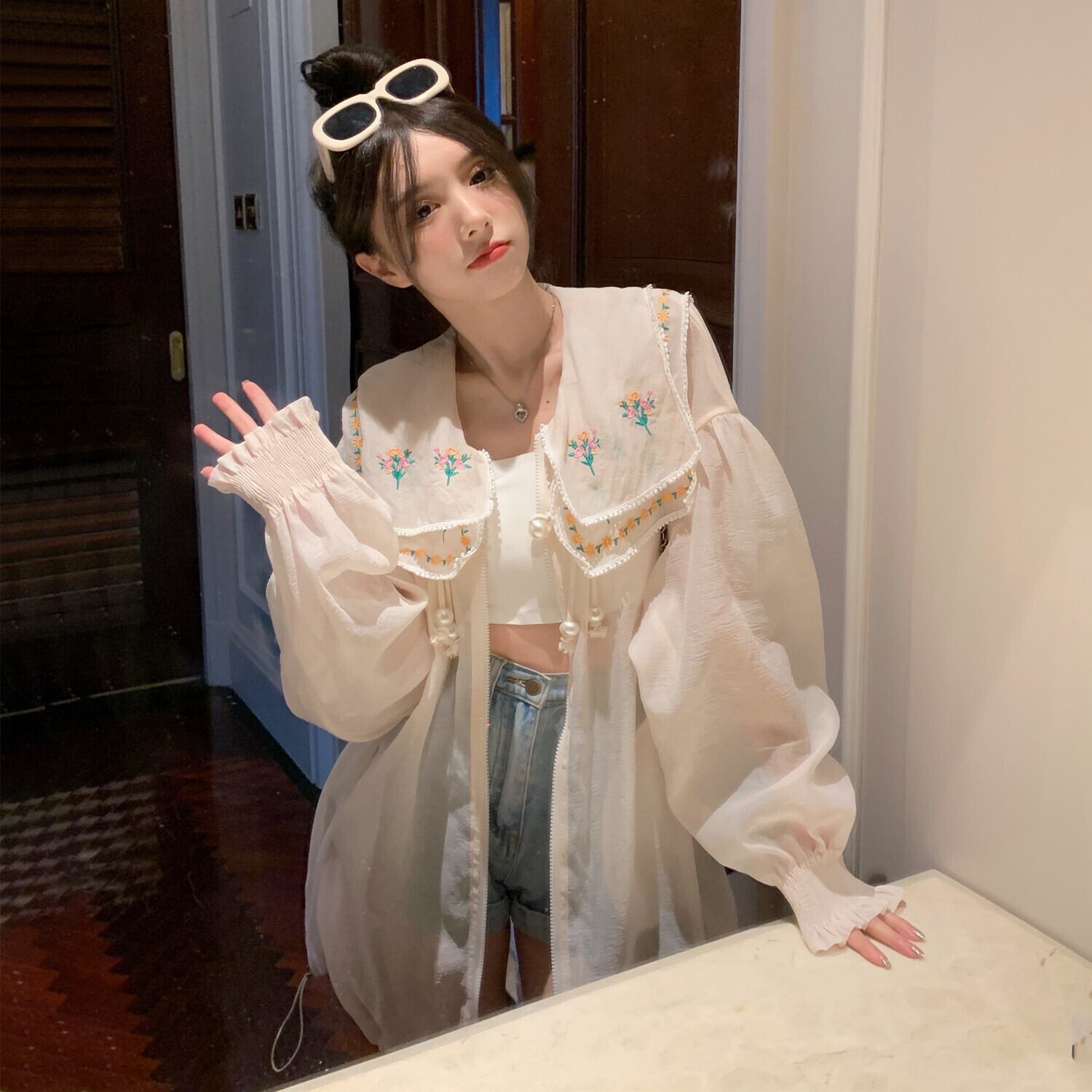sense doll collar flower embroidery sunscreen jacket women's summer loose mid-length shirt French niche top 刺繍 サマー 夏物 フラワーデザイン s576120466473336