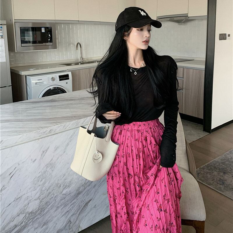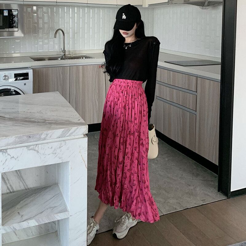 Pleated Floral Skirt Women's Spring Small Medium Length A-line Skirt Waist Thin Hip Covering Long Skirt ロング プリーツ スプリング 春物 花柄 スカート Aライン s576163124081592
