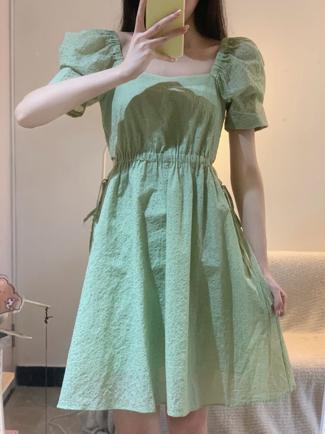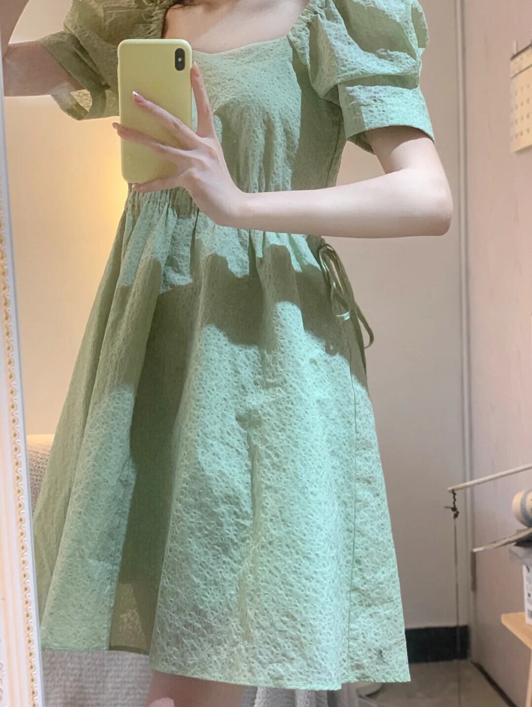 Puff sleeves square neck dress female summer 2022 new French temperament sweet little gentle waist skirt 大人ガーリー スウィート キュート カジュアル サマー 夏物 スカート スクウェア s576192475820678