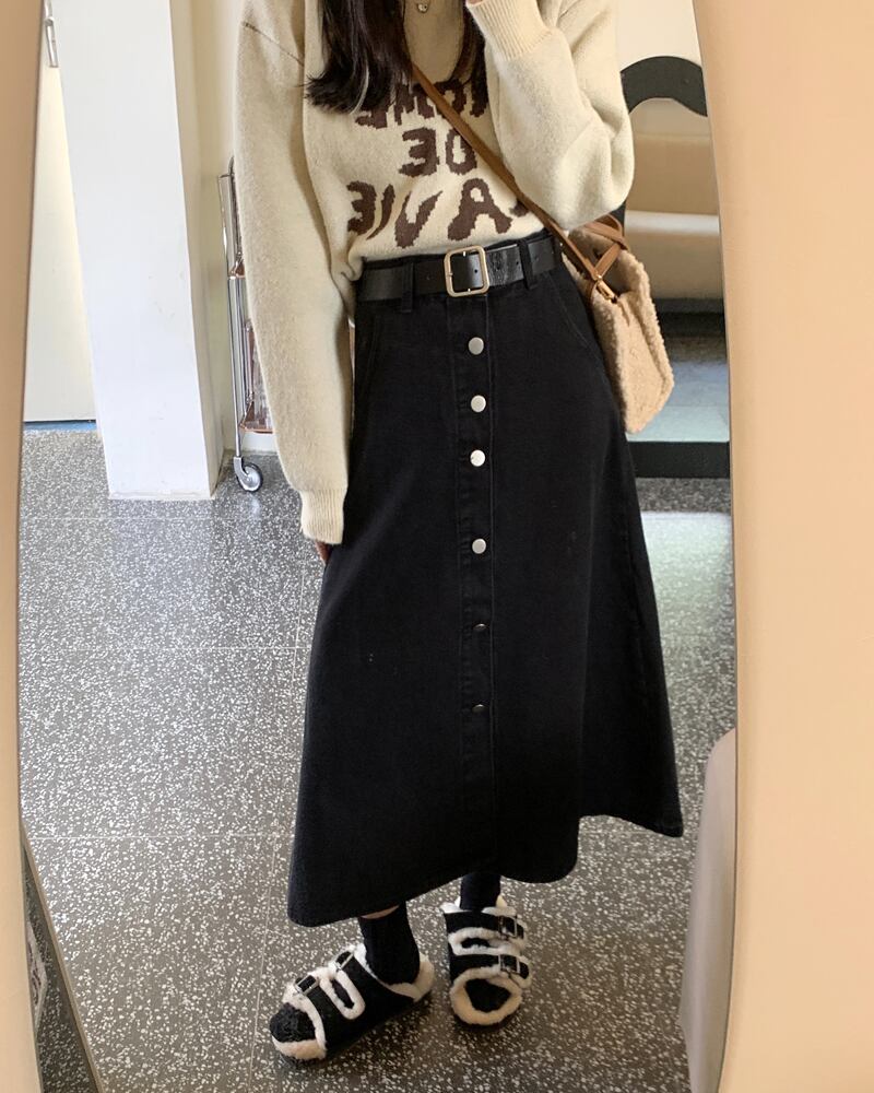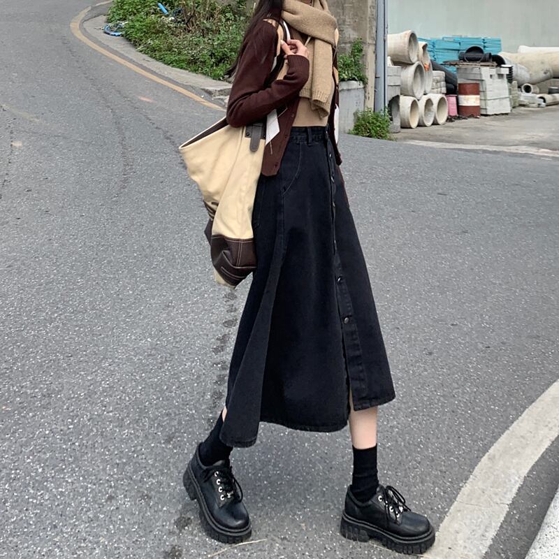 Black retro denim skirt women's autumn and winter high waist a-line skirt 2022 new umbrella skirt design sense long skirt ハイウェスト ロング ブラック レトロ オータム 秋物 ウィンター 冬物 スカート Aライン s576133022899210
