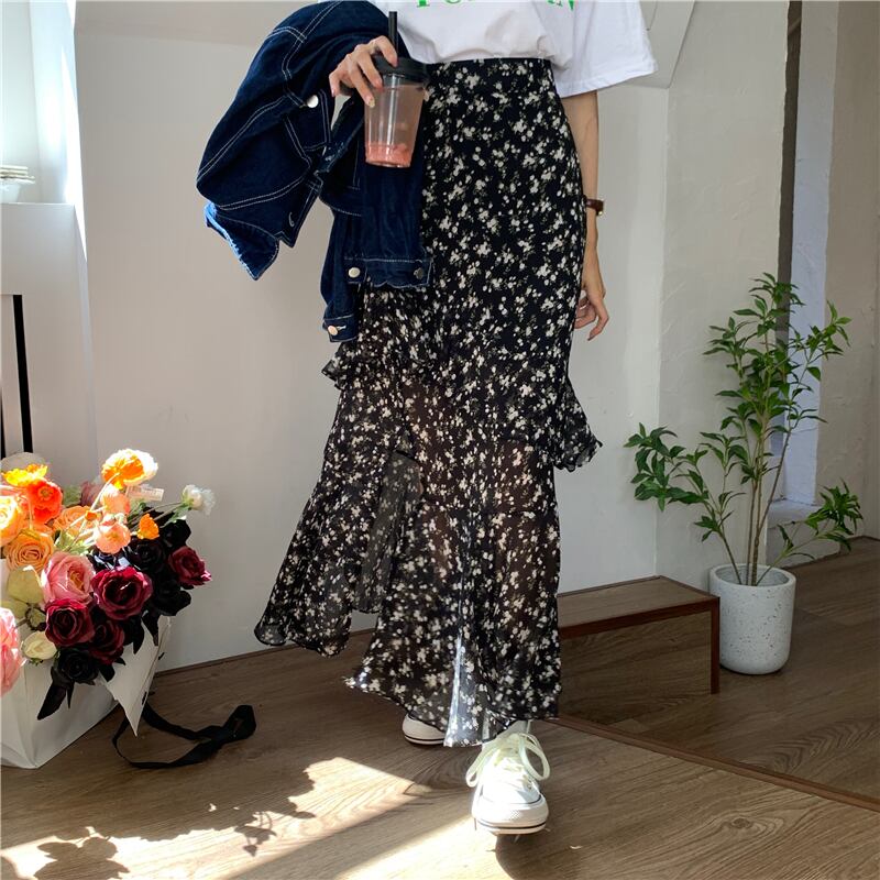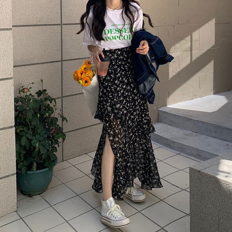 Black floral skirt women's summer design niche a-line skirt 2022 new irregular slit long skirt ロング ブラック サマー 夏物 花柄 スカート Aライン s576143351838495