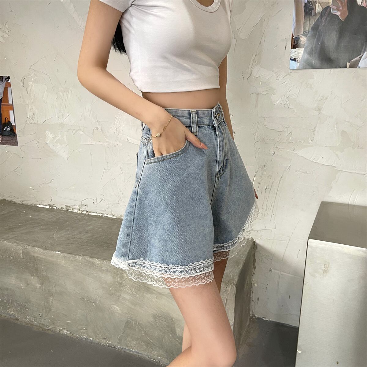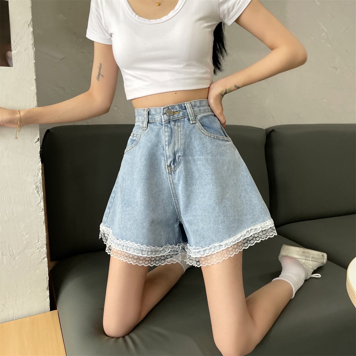 Sweet Spice Lace Denim Shorts Women's Summer Small 2022 Waist Chic Wide Leg Pants レース 大人ガーリー スウィート キュート カジュアル サマー 夏物 ショーツ ブルマー ワイドレッグ ワイドパンツ s576154812574520