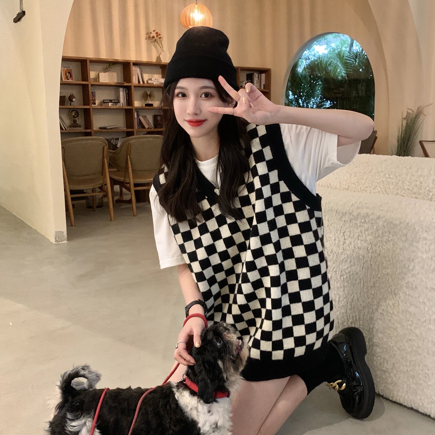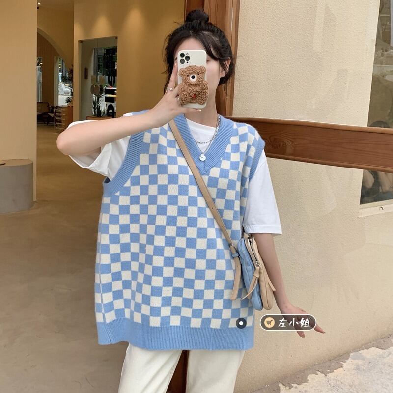 Checkerboard V-neck knitted vest, women's clothing, fashionable sweater, vest, layered, vest, vest, outerwear in spring and autumn スプリング 春物 オータム 秋物 Vネック s576133007899448