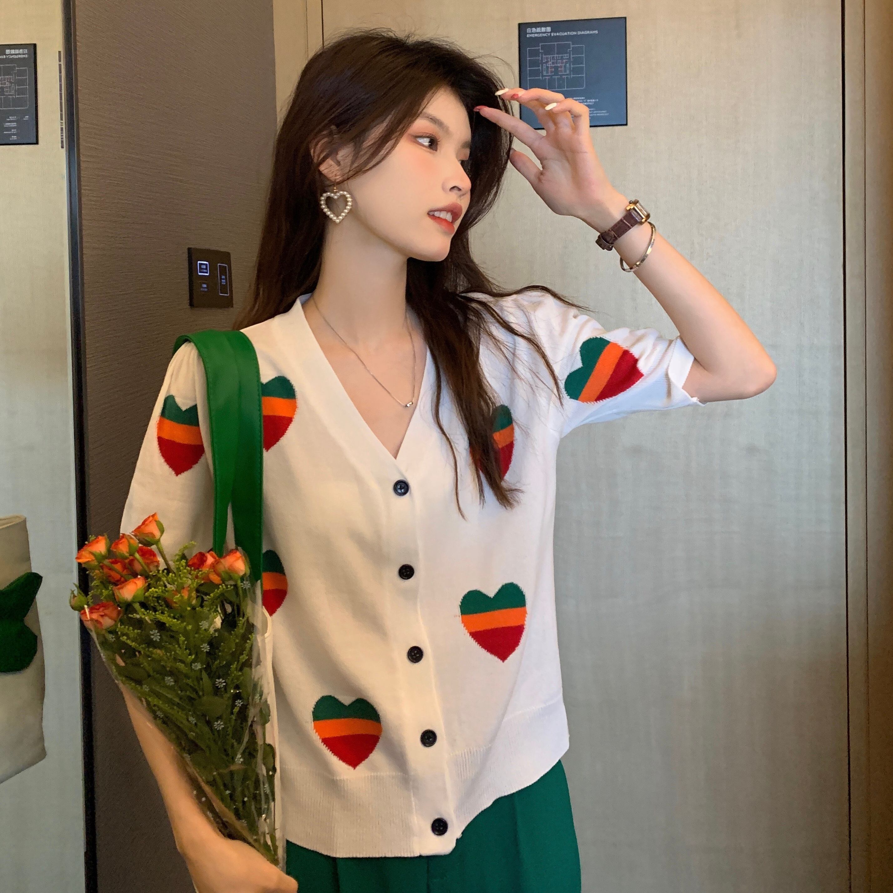 Gentle V-Neck Top Women's Small Summer Thin Sweater Chic Love Short Sleeve Sweater ショート 半袖 ハーフスリーブ サマー 夏物 Vネック s576161152751699