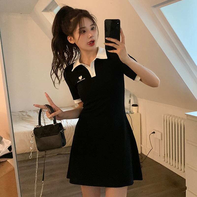 Black polo collar dress women's summer 2022 new preppy style small eign style age-reducing slim short skirt ショート ブラック サマー 夏物 スカート スリム s576180254209136