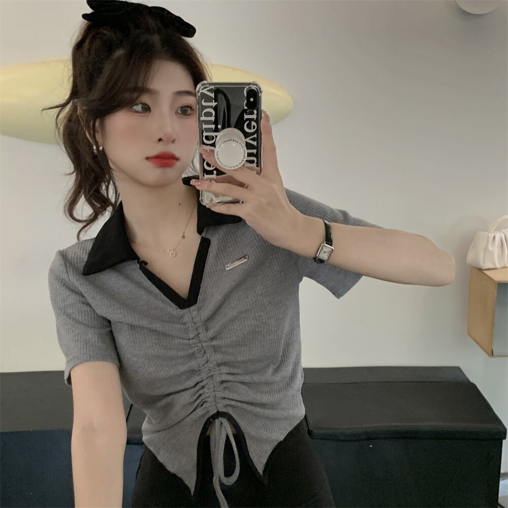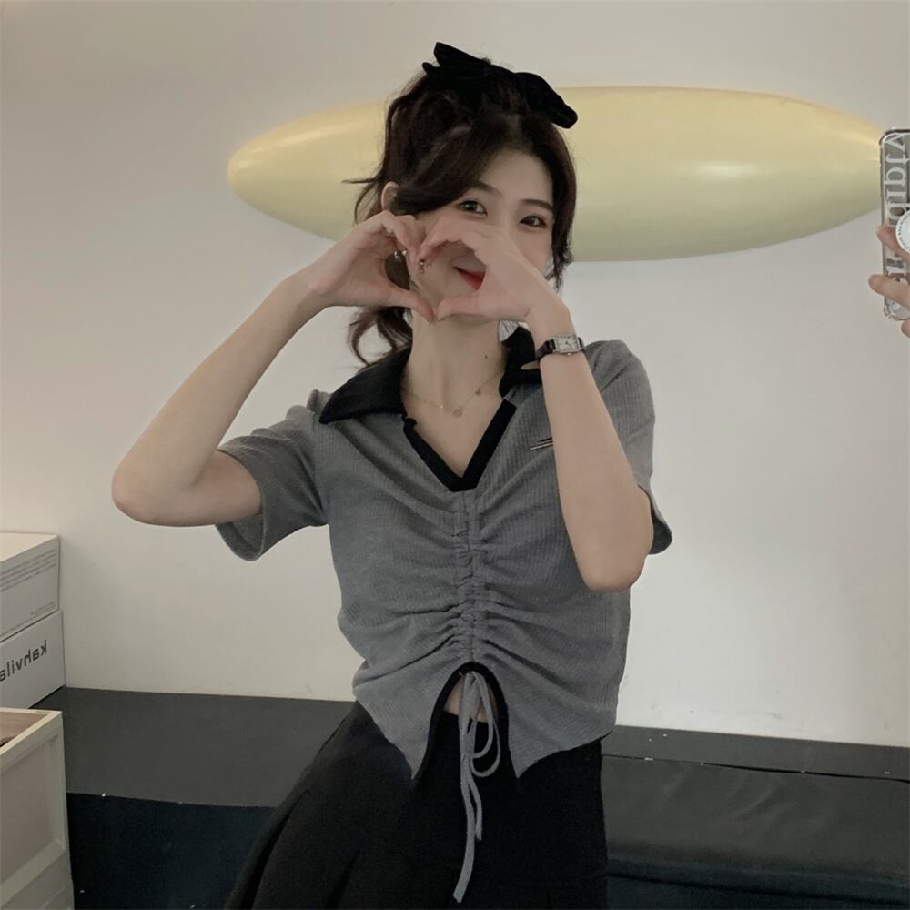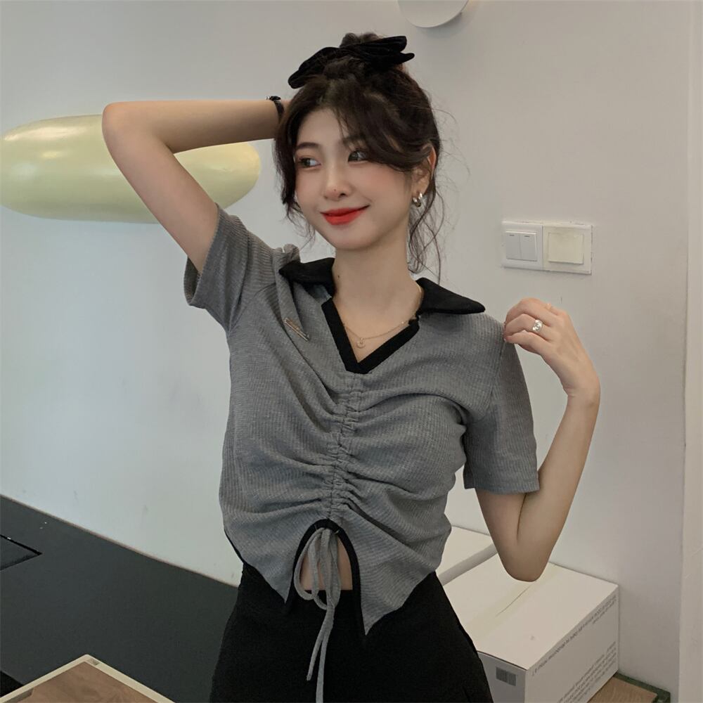 Spice Girl Front Shoulder Short Sleeve T-Shirt Women's Sensation Niche Summer Chic Hong Kong Taste Chic Unique Drawstring Short Top ショート 半袖 ハーフスリーブ サマー 夏物 Tシャツ s576137267938758