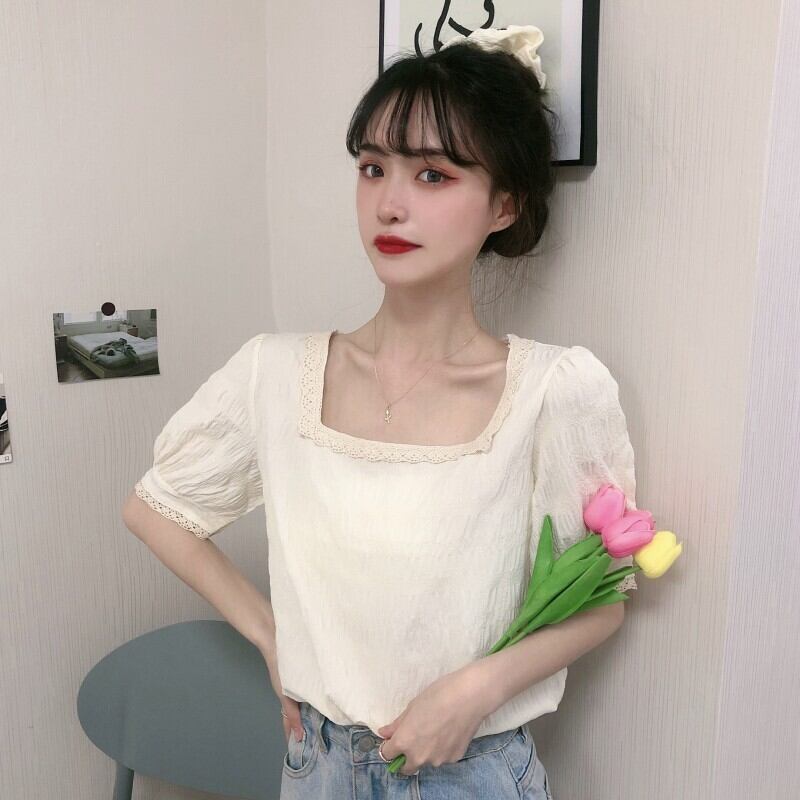style square collar short top women's summer design niche temperament chic gentle wind sweet puff sleeve shirt ショート 大人ガーリー スウィート キュート カジュアル サマー 夏物 スクウェア s576146119072224