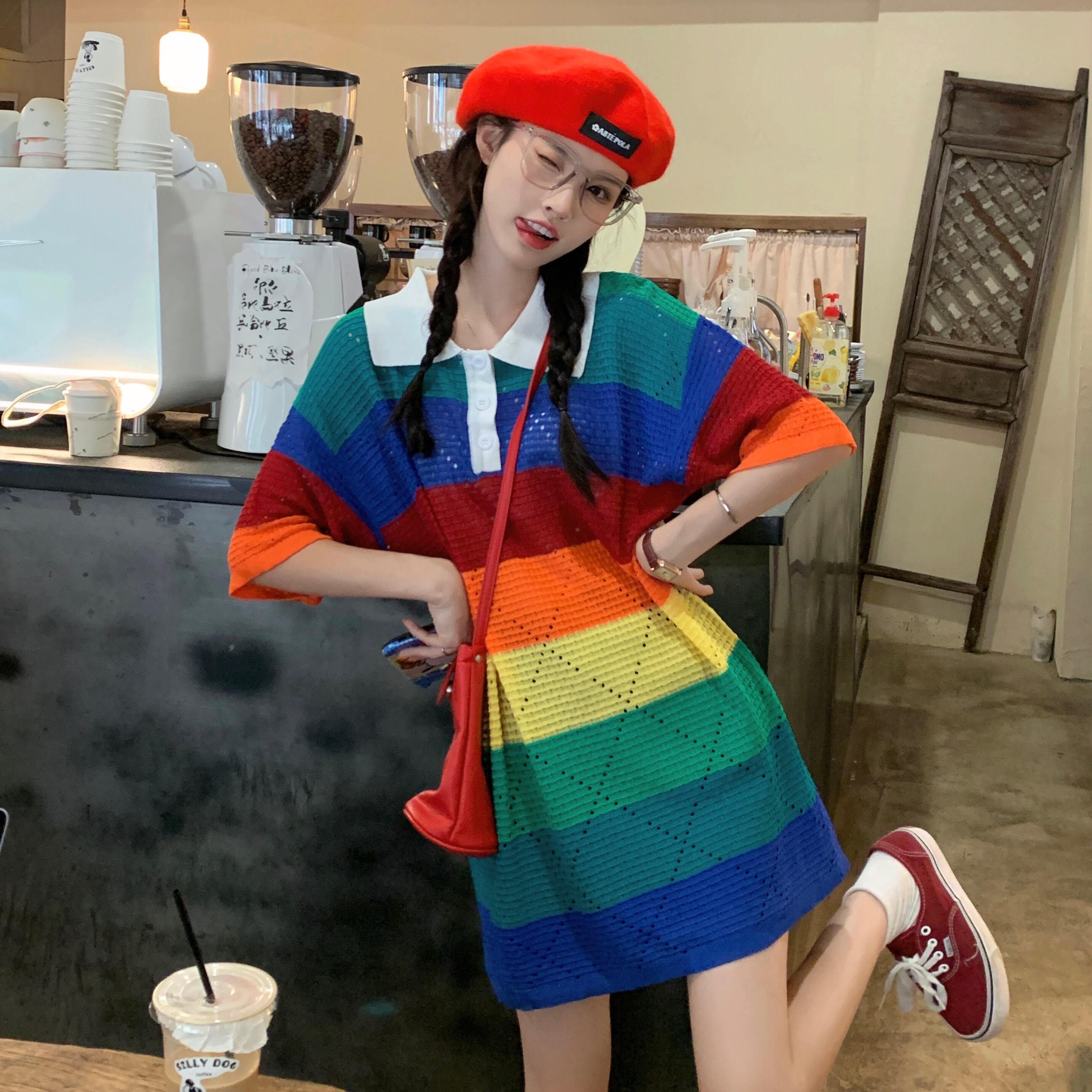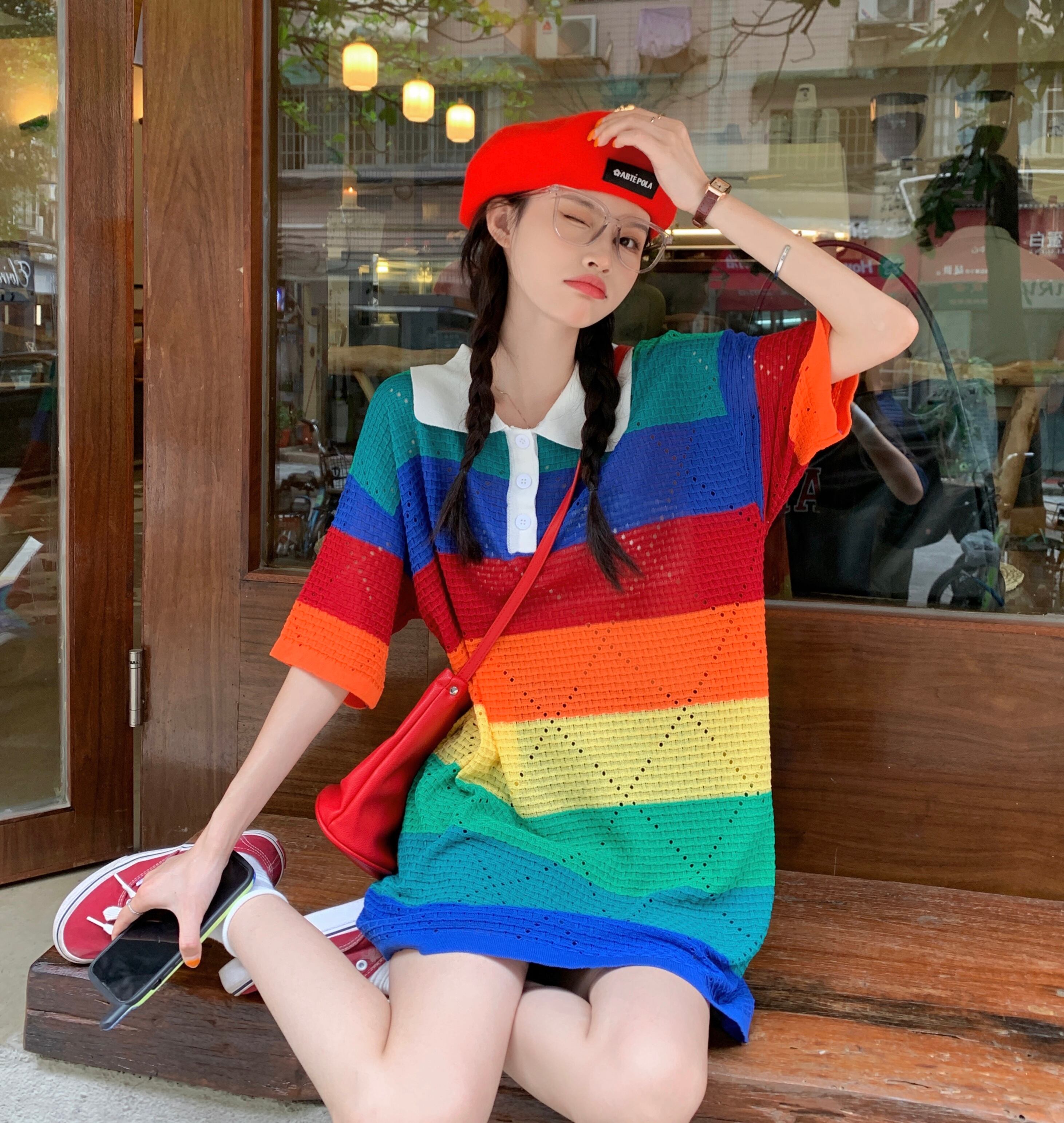 Rainbow striped short-sleeved T-shirt women's design sense niche summer bottoms missing polo collar mid-length tops ins tide サマー 夏物 ストライプ Tシャツ s576185337713919