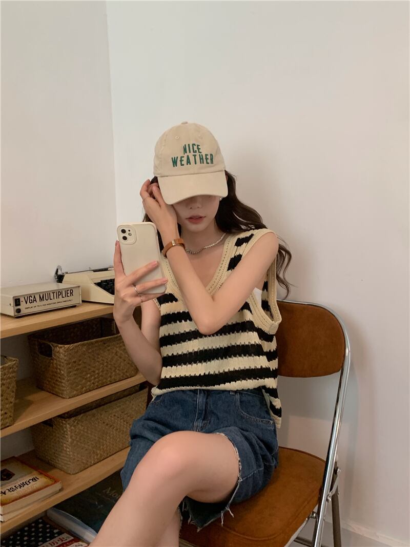 Striped sleeveless sweater women's summer 2022 new Hong Kong-style retro chic design sense of niche all-match clothes レトロ サマー 夏物 ノースリーブ ストライプ s576189600664960
