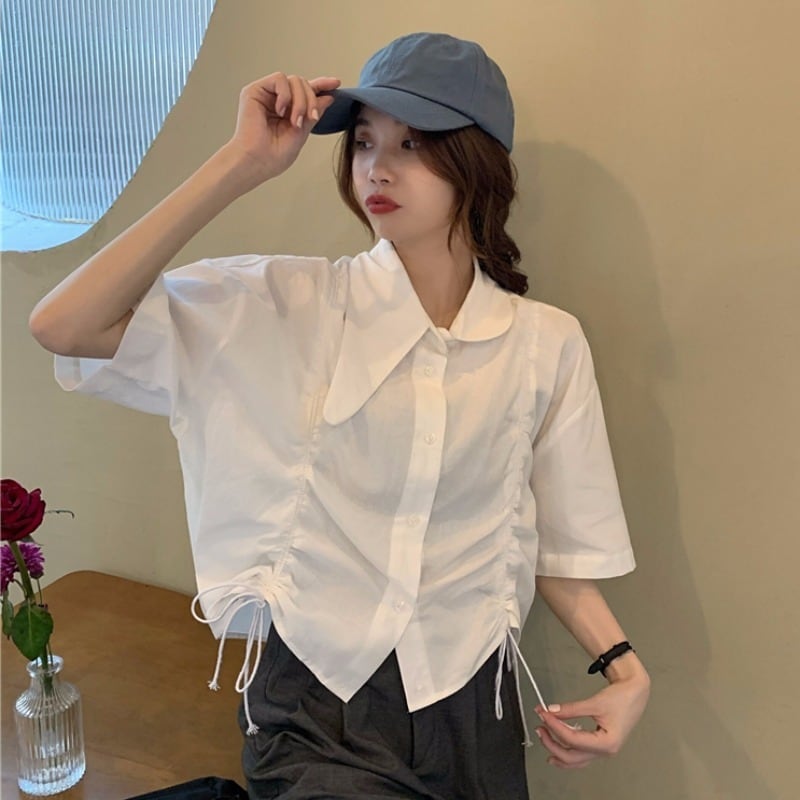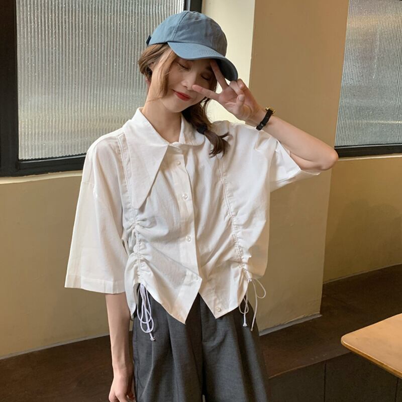 White shirt women's 2022 summer new design sense drawstring pleated short short-sleeved shirt polo collar top ショート ホワイト プリーツ サマー 夏物 s576124657293850
