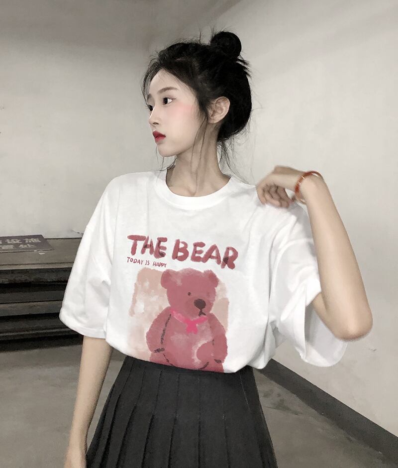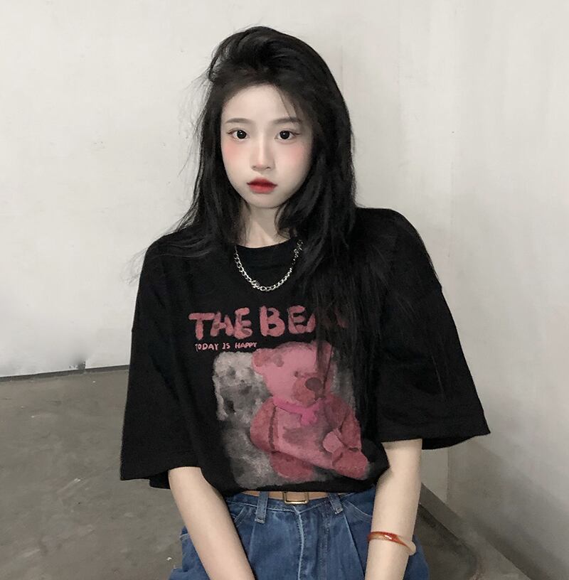 Bear short-sleeved T-shirt women's summer design niche 2022 new oversize Hong Kong style black top ブラック サマー 夏物 Tシャツ s57613431463125