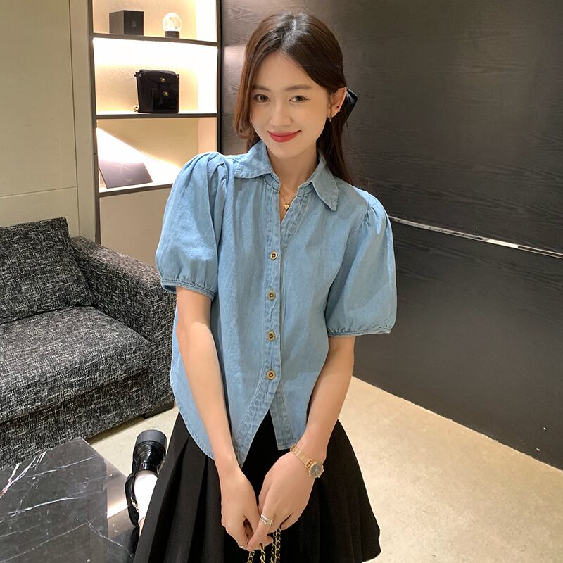 Puff sleeve denim shirt women's summer design sense high-level shirt 2022 new style small top サマー 夏物 s576167072096720