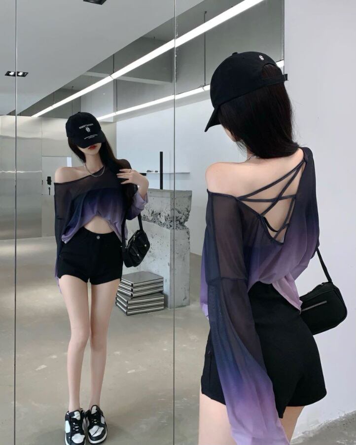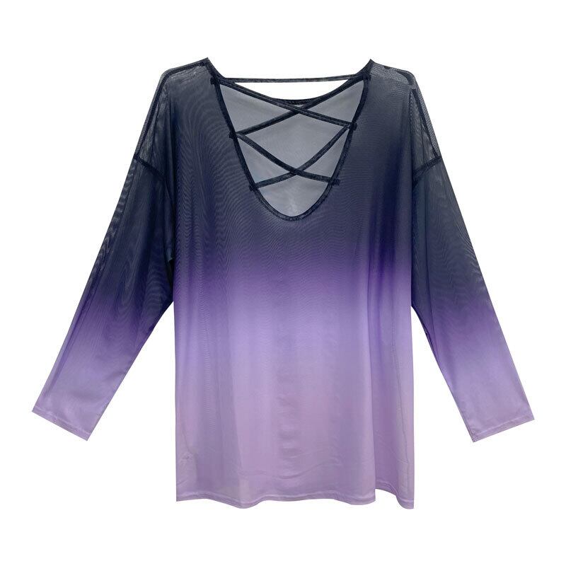 Gradient color sunscreen blouse women's summer thin long-sleeved T-shirt design sense niche loose transparent top ロング ブラウス サマー 夏物 Tシャツ s576164907781723
