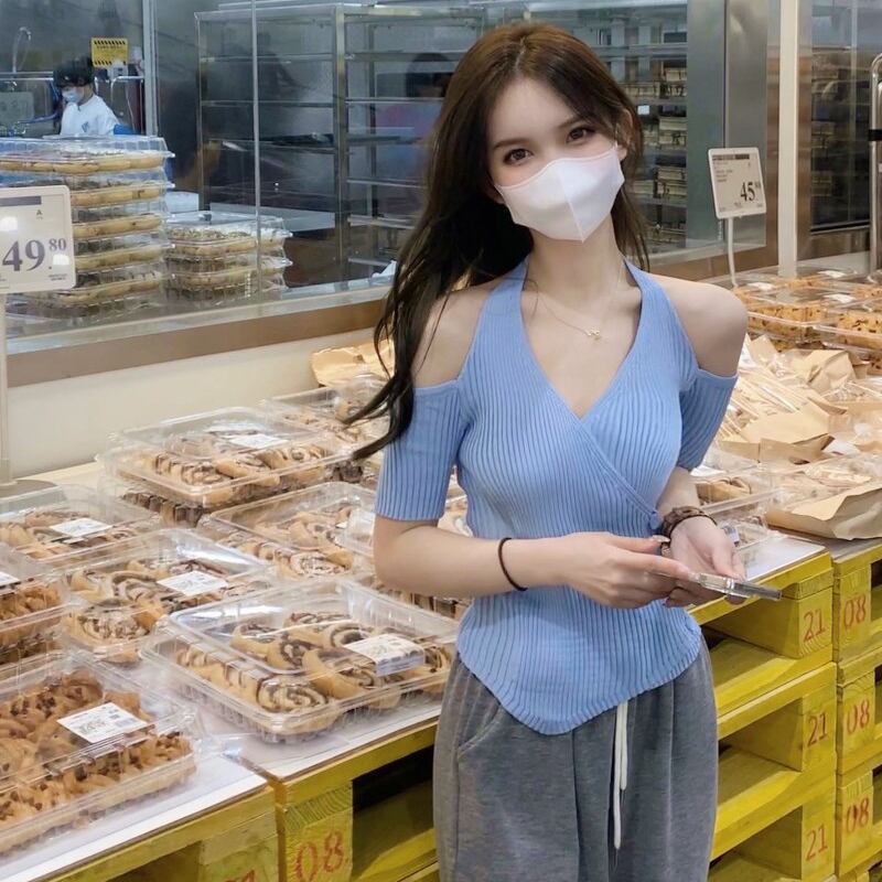 Hot hanging neck short-sleeved T-shirt women's design sense niche summer 2022 new slim knitted short top ins tide ショート サマー 夏物 スリム Tシャツ s576185315663106