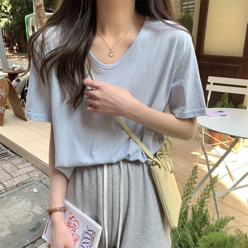 Front-shoulder white short-sleeved T-shirt women's clothing design sense niche summer chic unique unique all-match pure cotton v-neck top ホワイト コットン サマー 夏物 Vネック Tシャツ ピュア s576191401950885