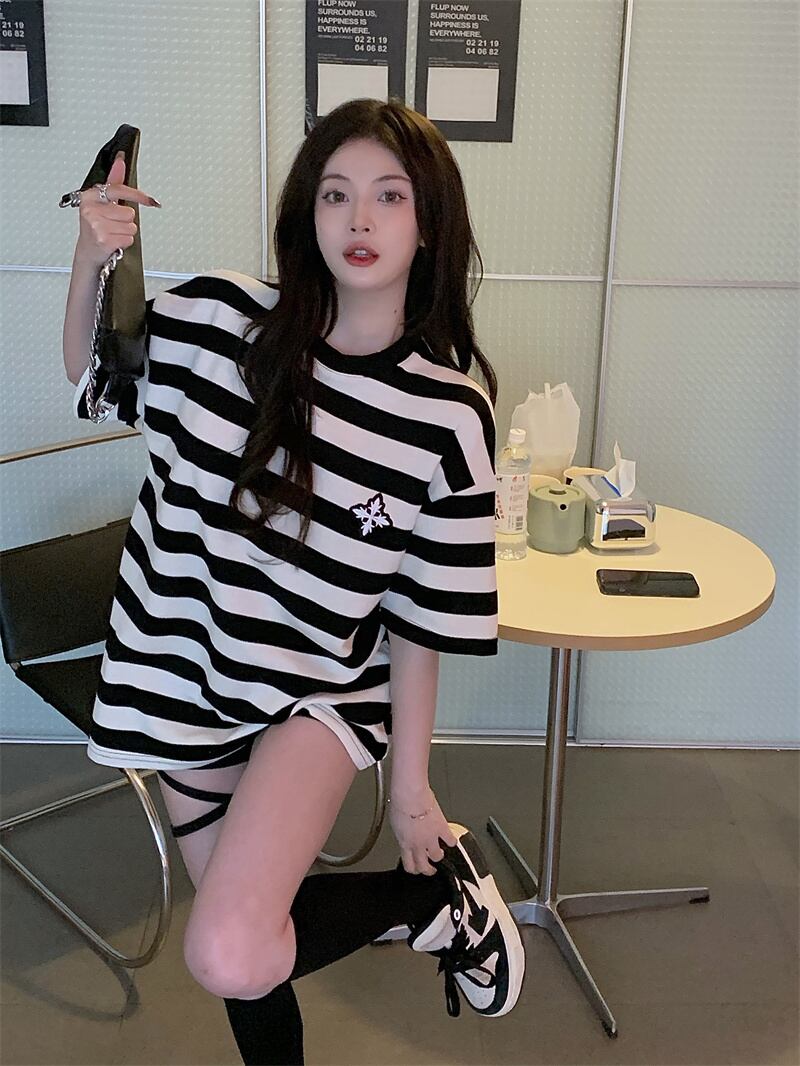 Striped short-sleeved T-shirt women's summer design niche 2022 new loose version mid-length casual top カジュアル サマー 夏物 ストライプ Tシャツ s576168950527885