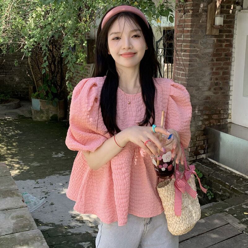 temperament short top women's summer 2022 new design sense small shirt pink puff sleeve shirt ショート ピンク サマー 夏物 s576126543261418