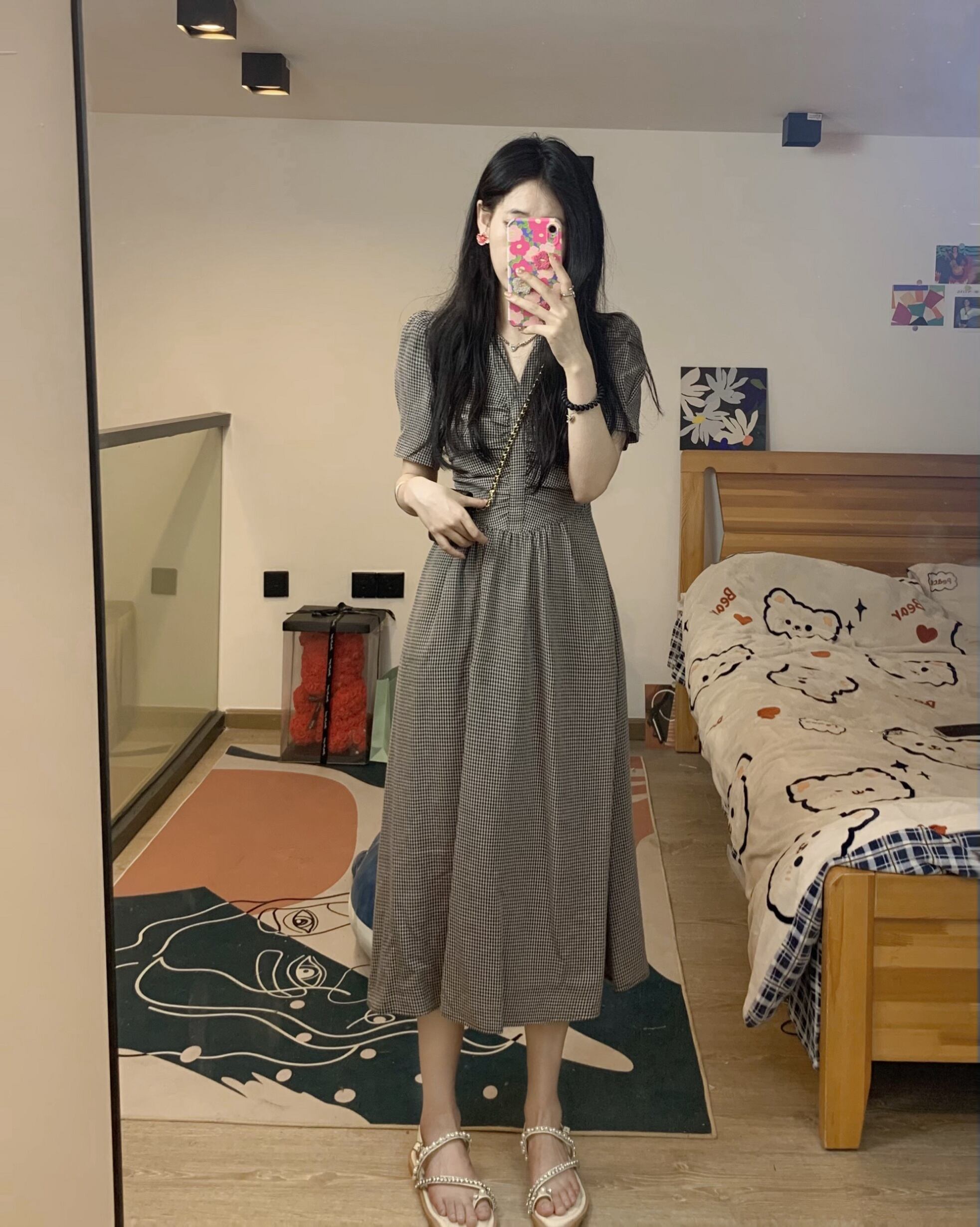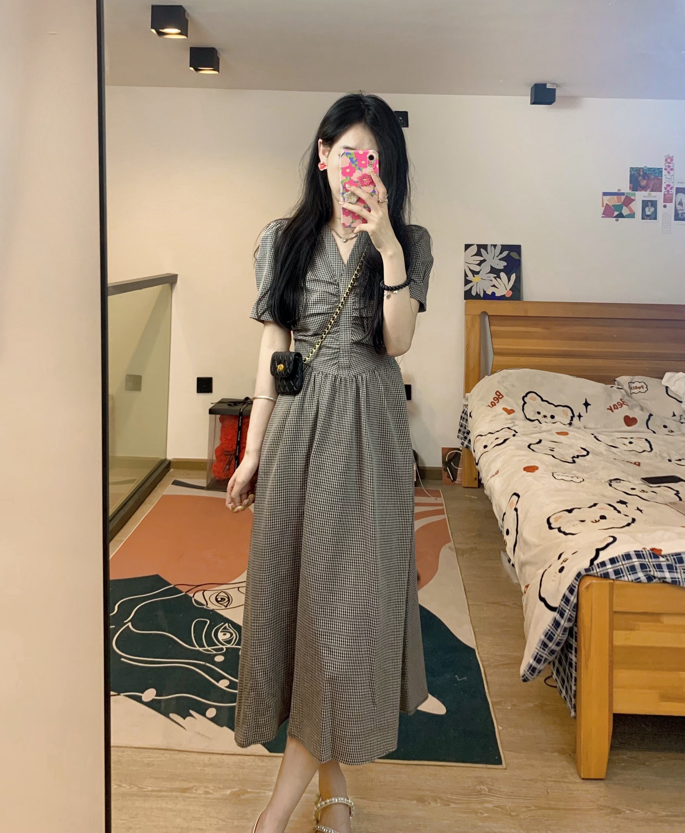 Plaid V-neck dress female summer 2022 new French retro high-quality temperament light mature waist long skirt ロング レトロ サマー 夏物 スカート Vネック s576179575721656