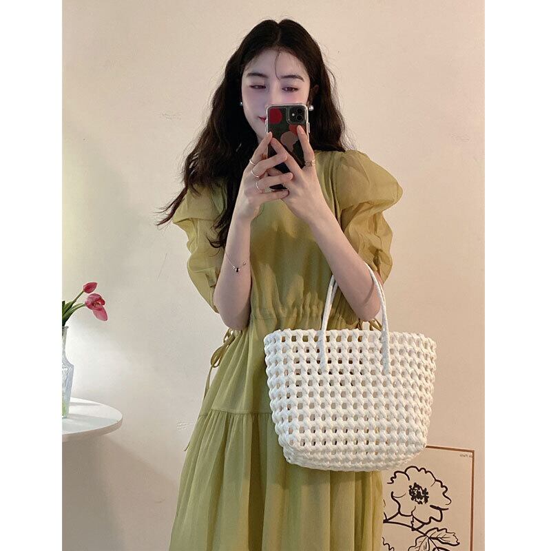 Green puff sleeve dress women's design sense niche summer gentle milk sweet and chic waist long skirt ロング 大人ガーリー スウィート キュート カジュアル サマー 夏物 スカート グリーン s576188692092448