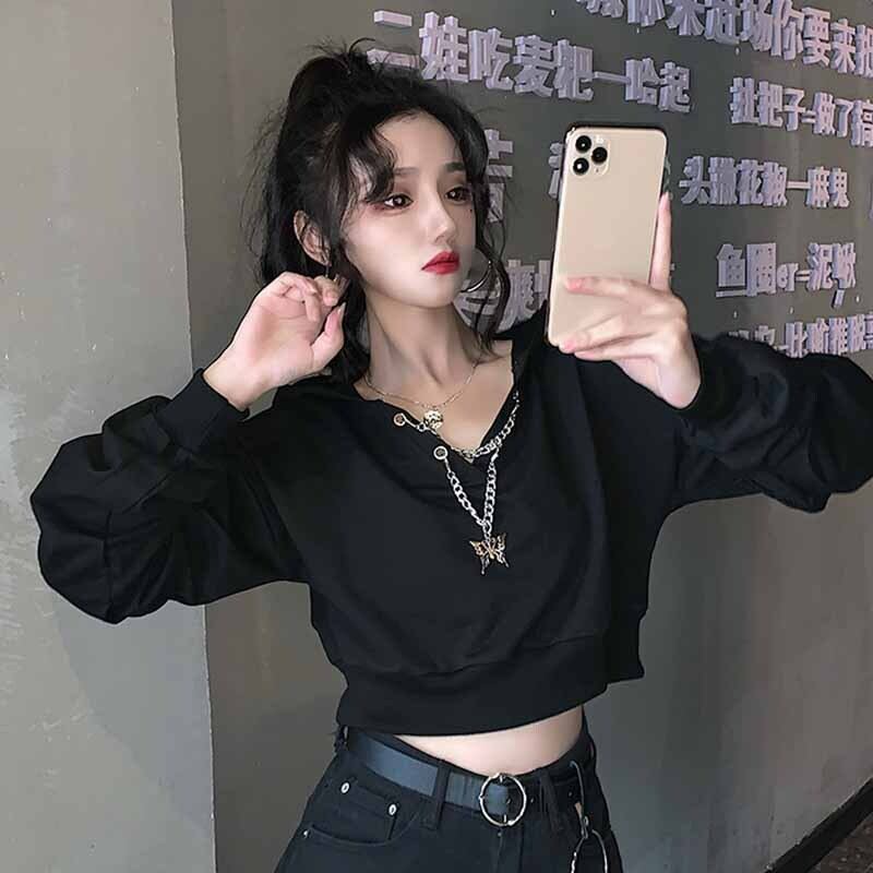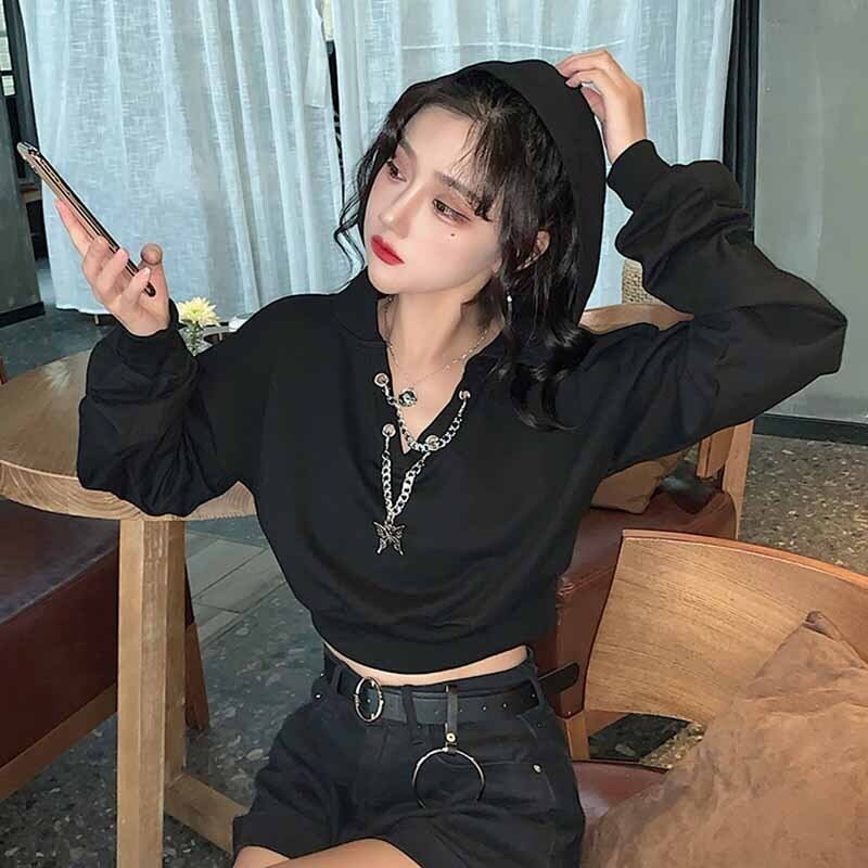 Tooling hooded short sweater women's fashion trendy spring and autumn 2022 new thin black long-sleeved jacket ショート ロング ブラック スプリング 春物 オータム 秋物 s576177669313922