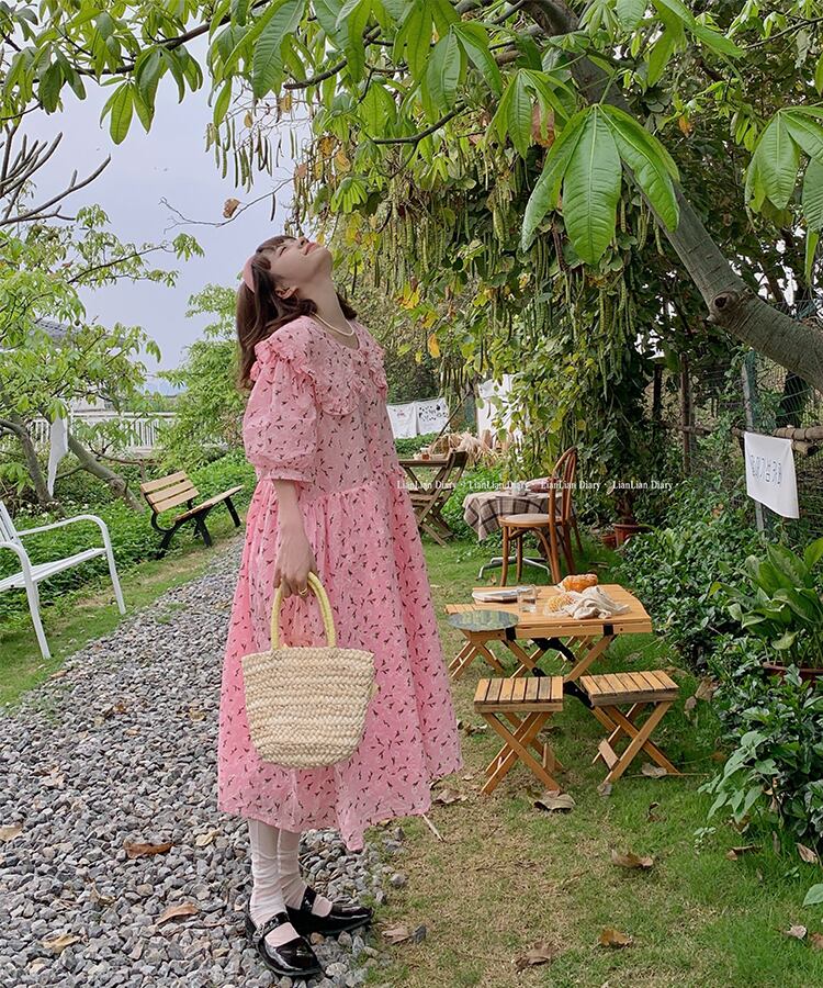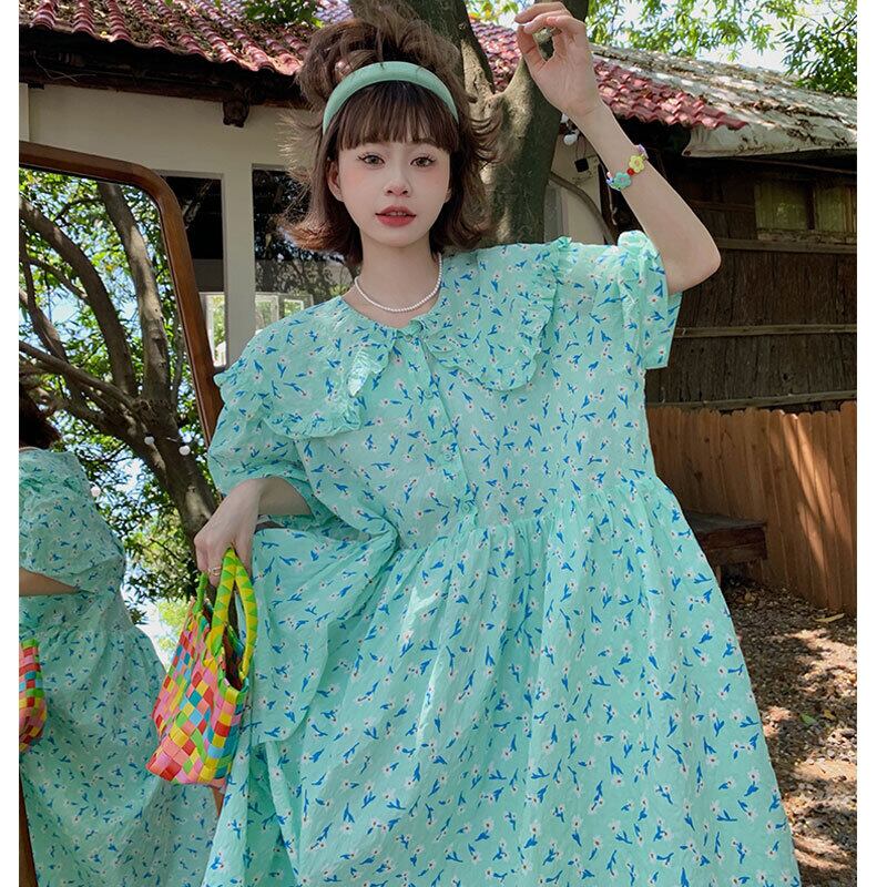 Doll Collar Floral Dress Women's Sense Small Summer Gentle Style Sweet Puff Sleeve Long Skirt ロング 大人ガーリー スウィート キュート カジュアル サマー 夏物 花柄 スカート s576121799408180
