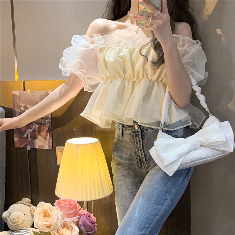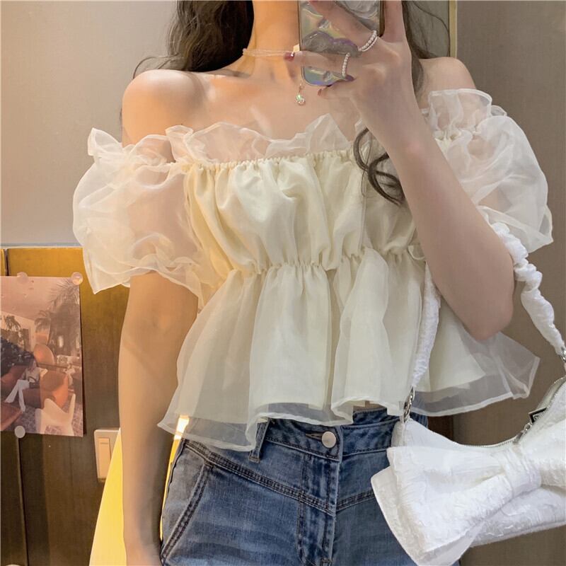 Sweet Spice Girl One-Shoulder Short Top Women's Summer Sense of Small and Beautiful Chic Small Shirt Short Sleeve Chiffon Shirt ショート シフォン 半袖 ハーフスリーブ 大人ガーリー スウィート キュート カジュアル サマー 夏物 s576170865125632