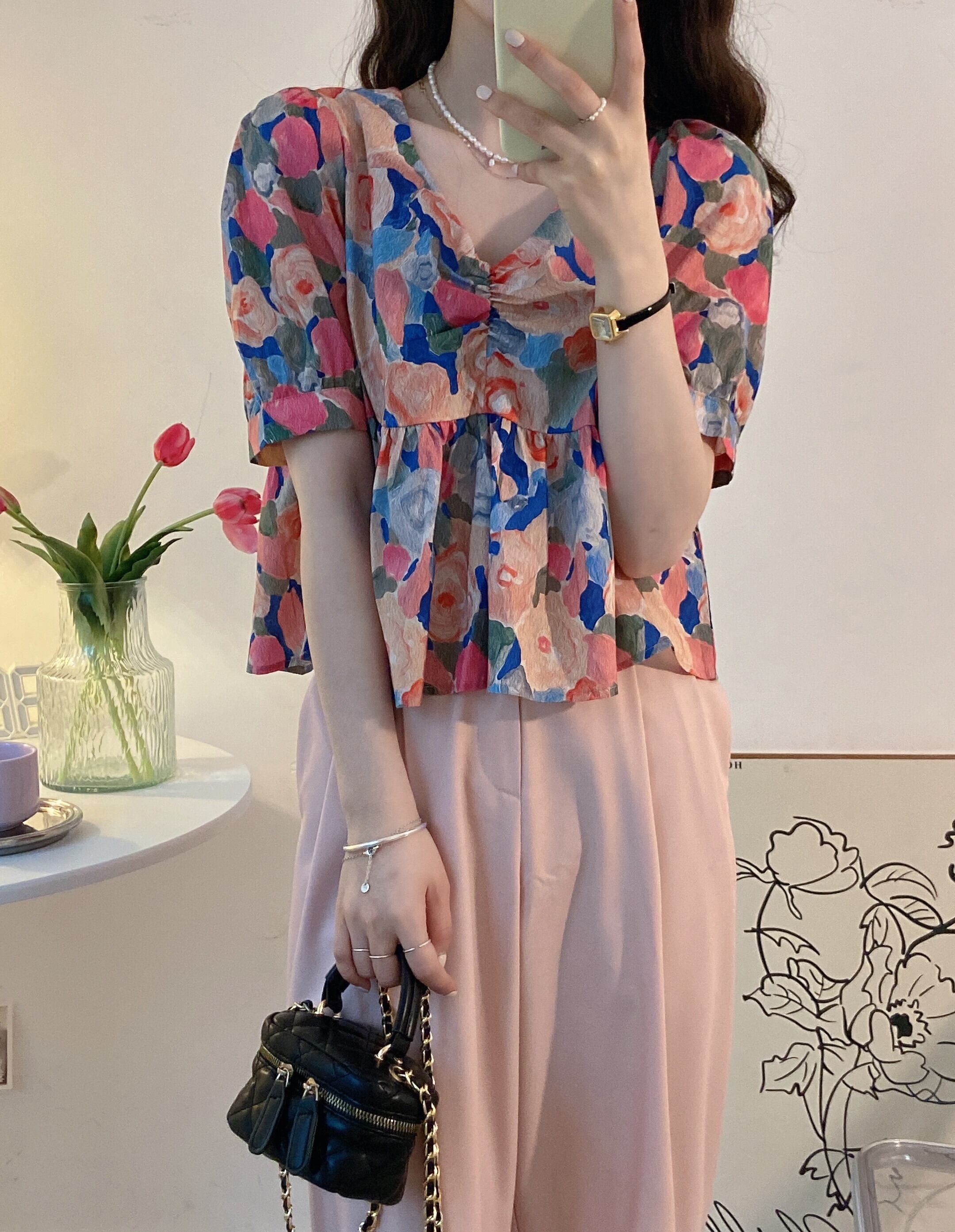 French retro small short top women's summer high-end chic shirt 2022 new puff sleeve shirt ショート レトロ サマー 夏物 s576178751371094