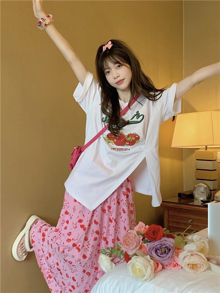 色:ローズレッドT-shirt,ホワイトt-shirt,Crushflowerスカート,グリーン花柄ドレス